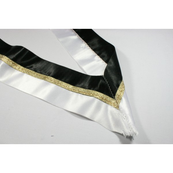 Composé de 2 bandes de Satin de 4cm de large cousues côte à côte + un liseré couleur argent cousu par dessus au milieu.